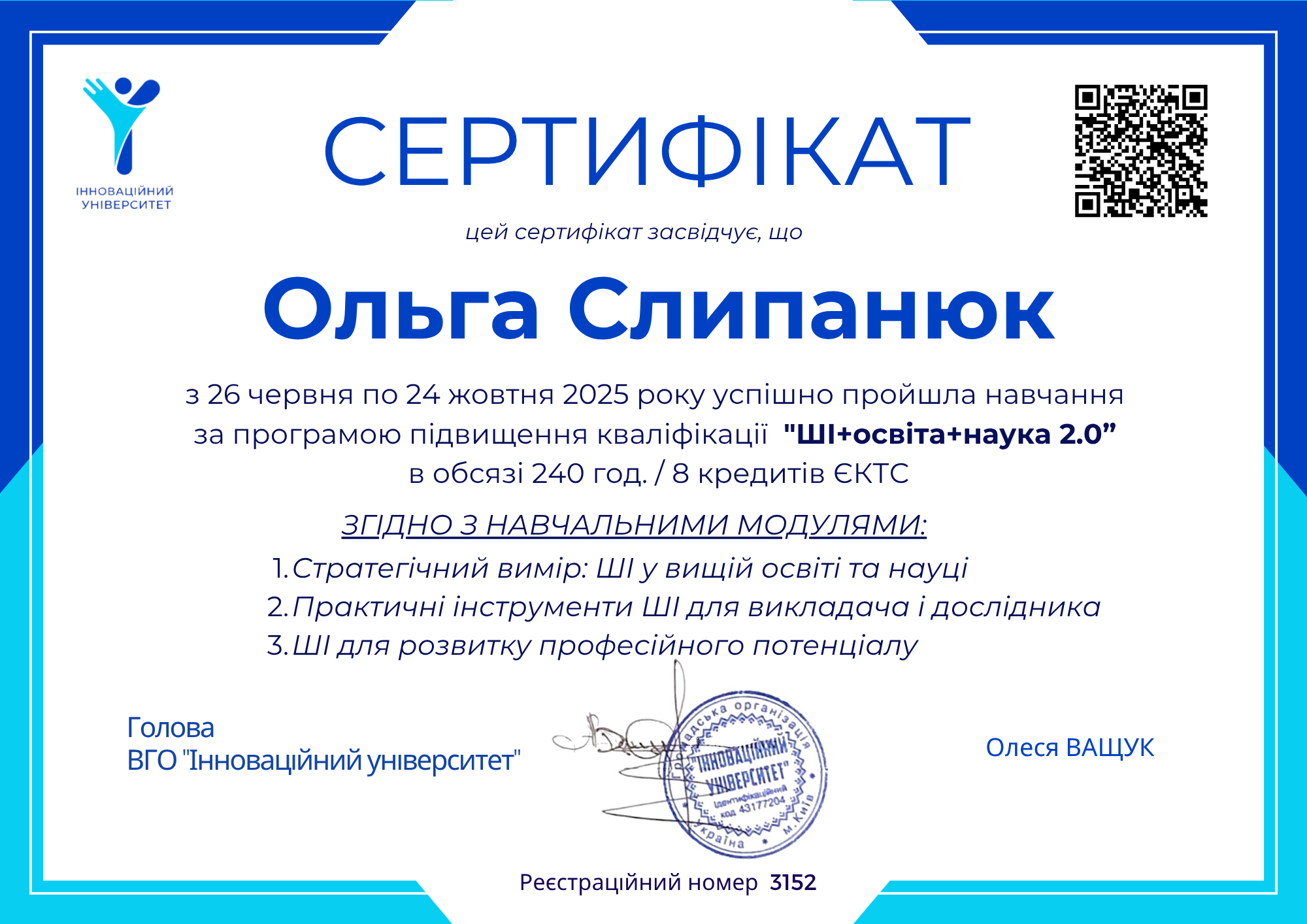 ВГО «Інноваційний університет» тема: «ШІ + освіта + наука 2.0» , 26 червня -24 жовтня 2025 року,    240 год. 8 кредитів, Сертифікат № 3152.