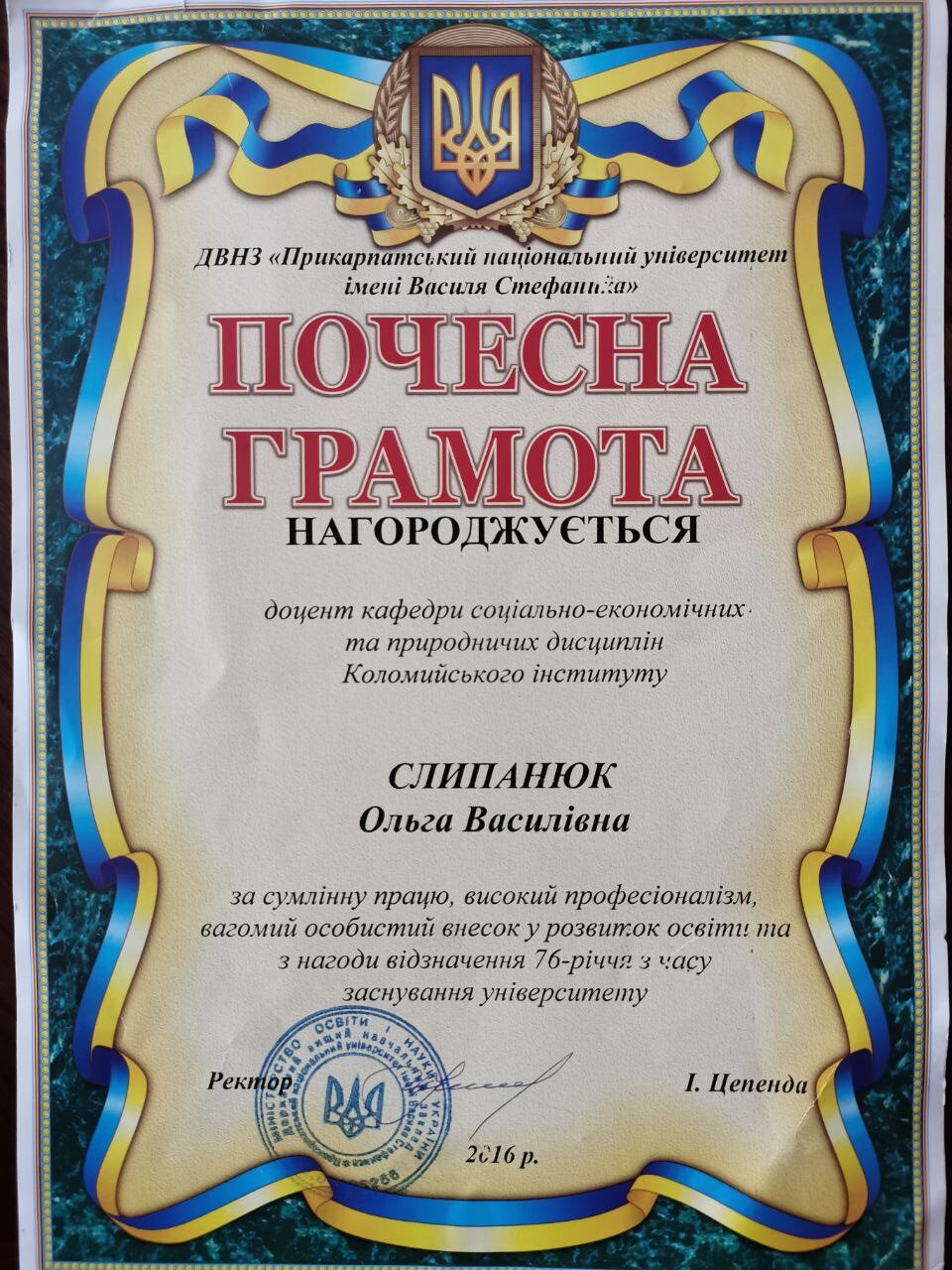 Почесною грамотою ректора університету  за сумлінну працю, високий професіоналізм, вагомий особистий внесок у розвиток освіти  2016 р.