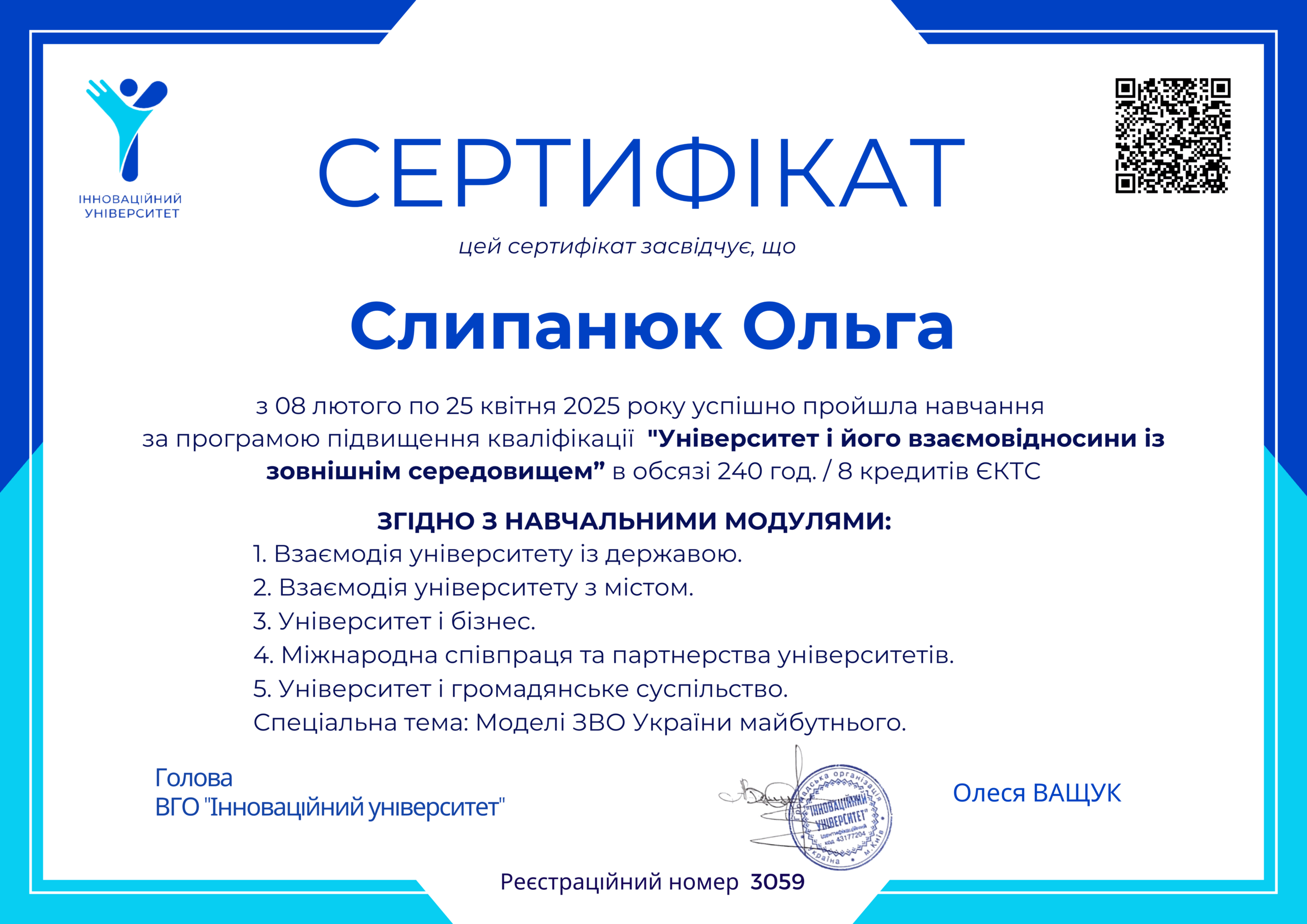 ВГО «Інноваційний університет», тема «Університет і його взаємовідносини із зовнішнім середовищем».  Спеціальна тема: «Моделі ЗВО України майбутнього»  08.02 – 25.04.2025 року 240 год. 8 кредитів, Сертифікат №3059