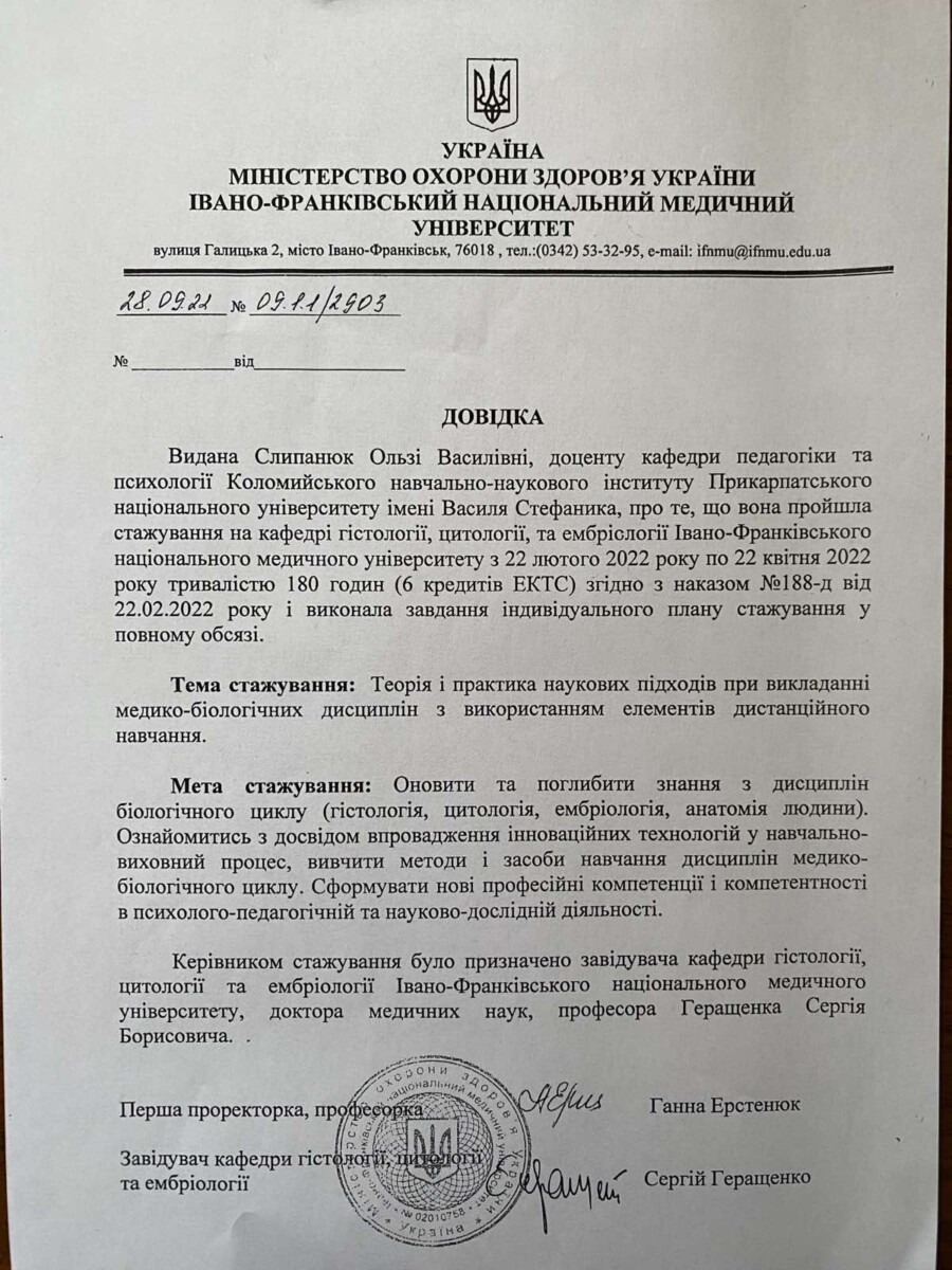 Івано-Франківський медичний університет, кафедра гістології, цитології та ембріології, від 22.02.2022 до 22.04.2022р Довідка № 09.1.1/2903 від 28.09.22